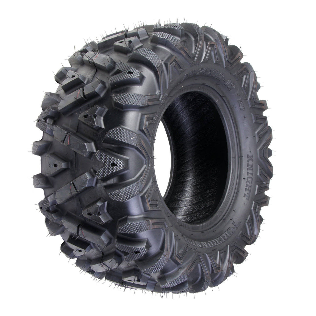 Forerunner Knight The new Knight should be your number one choice when looking for an ATV tyre that feels right at home on almost any surface! On Mixed or soft ground in Mud or Sand and on Rock! Utilizing a versatile zig-zag block pattern this tyre is full of grip! Available in: 25x8x12 25x10x12 26x9x12 26x12x Depth: 20mm