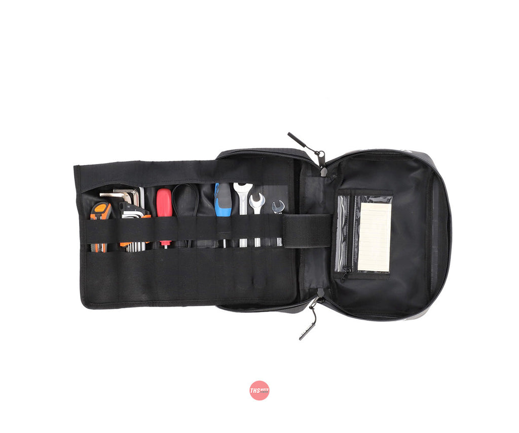 Practical and compact toolbag that quickly attaches to the front fender using four metal hooks. Rubber-coated outer fabric for easy cleaning and increasing water resistance, with rubber base for extra grip.