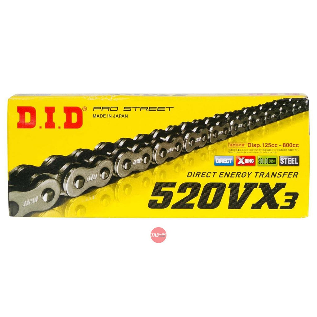 D.I.D. 520 VX3 Chain - X Ring Upgraded chain from the D.I.D. 520 VX2 chain New "Direct Energy Transfer" gives you amazing throttle response due to D.I.D. State-of-the-Art technology to increase the chain's rigidity New 520VX3 chain will fit a wider range of motorcycles: 125cc - 800cc Longer chain life - the 520VX3 has a greatly imrpoved seal performance due to increased X-Ring retention and durability Clip style masterlink included