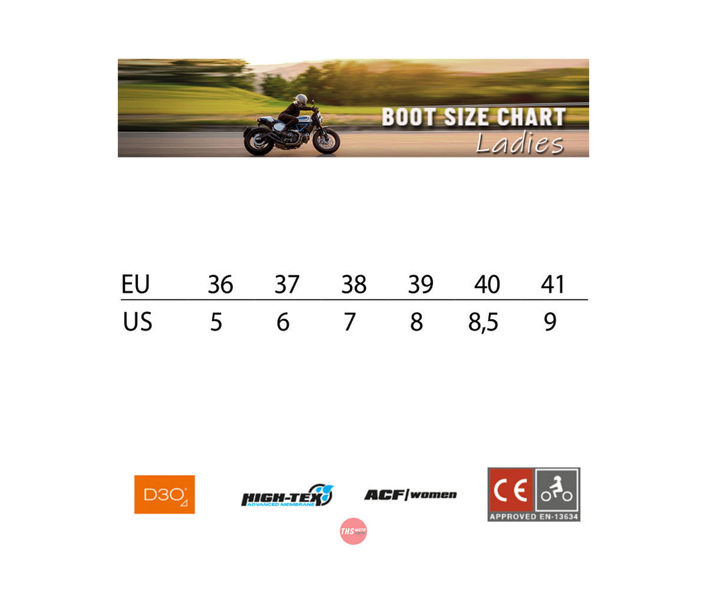 The Falco Viky is a modern womens motorcycle boot with style and protection as a given. Made from full-grain leather for enhanced abrasion resistance and a luxurious look. The High-Tex Advanced Membrane is resistant to water penetration and is certified waterproof. The D3O Impact Protection, developed in snow sports and the military industry, was first applied to motorcycle boots by Falco. "D3O Intelligent Molcules" flow freely when moving slowly but on shock, lock together to absorb impact energy. Transmitted force to ankle cup area is significantly reduced thanks to D3O exclusive support. The Falco Viky motorcycle shoe is specially designed for the female foot to improve comfort and durability.