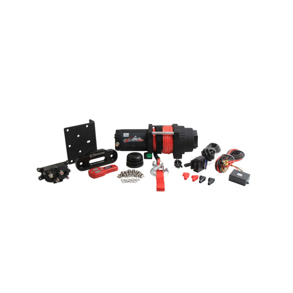 This 4- bolt winch includes a wireless remote, handlebar switch, rubber cable stopper, fairlead, hook handle, and 1-year warranty as standard equipment.