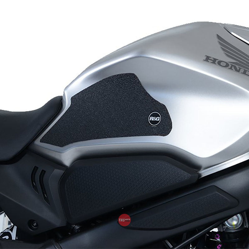 R&G Tank Traction Grips for Honda CB650R '19-, CBR650R '19- & CB650F '19- (EZRG346) R&G Tank Traction Grip kits are available for many different bike styles and brands, with new applications released regularly. The unique R&G Traction Grip texture was specifically designed to be both soft and durable, providing the rider with the grip and feel he/she needs to assist in better bike control, enabling the rider to maintain a stable body position while cornering and braking, whilst also relieving fatigue and providing the rider with complete confidence allowing him/her to fully focus on the road (or track) ahead instead of slipping and sliding on the tank. Each Tank Traction Grip kit is supplied with precision pre-cut adhesive pieces, designed to fit the intended bike, typically in either 2, 4 or 6 pieces (in total) depending on the shape of the tank and adjoining fairing. The high-strength adhesive backing ensures a highly durable product that will stay exactly where you put it, as well as not affecting or damaging paintwork. R&G Tank Traction Grips work in both wet and dry conditions and is equally at home on the track as it is on the commute home! Please note: R&G Tank Traction Grips now come with a 25mm diameter stick on emblem. This 2 piece R&G Tank Traction Grip kit has been specially designed for the Honda CB650R '19-, CBR650R '19- & CB650F '19- model. Made in the UK