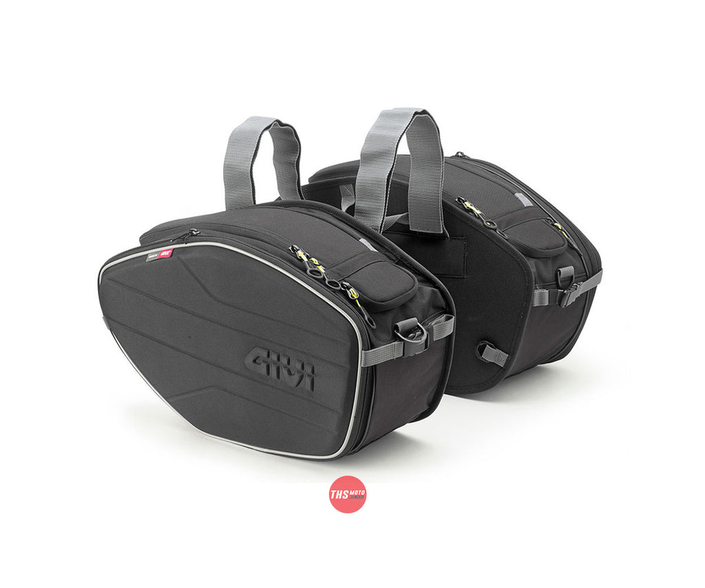 Pair of expandable 30 litre saddle bags made with 600D PU, thermoformed frontal in EVA, coated in polyester hexagonal design, to increases rigidity and stability.