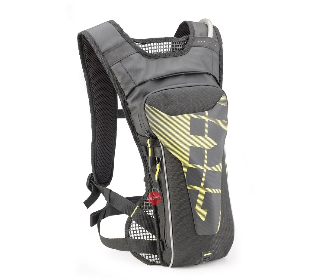 Rucksack with integrated water bag, 3 ltr. Thanks to the perfect adherence to the rider's body and the 2-litre HydraPak Elite bag, it is particularly suitable for off-road use. Materials (manufactured within REACH recommendations): • High-tenacity 1200D W/R polyester • Hypalon inserts • High UV-resistant external material As standard: • Main pocket with HydraPak Givi Elite 2L water bag included; • Locking system to keep drinking tube on shoulder strap; • Secondary pocket; • Stabilised handle; • Breathable back panel; • Chest strap with whistle; • Quick-release shoulder straps make it easy to remove the rucksack from the shoulders; • Reflective inserts.