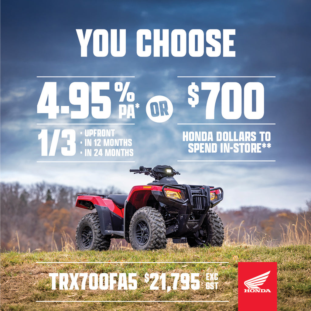 When it comes to our TRX700, there’s big news, and some big improvements too. Check out these highlights —new, bigger 26-inch tires with a more aggressive tread pattern, mounted on new cast-aluminum wheels. New instruments with a bigger screen that’s easier to read. More integrated storage. New racks front and rear that can carry heavier loads (50 percent more for the front and 42 percent more for the rear) and now feature our super-convenient Honda Pro-Connect® accessory quick-attach system. Updates to the automatic transmission. A bigger, tougher front bumper, and sharp new styling.