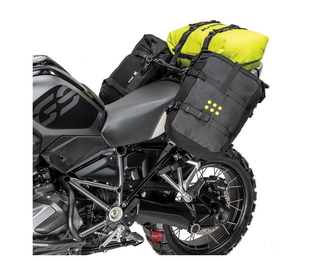 Introducing the heavy-duty, rackless Kriega luggage harness designed to fit most models of BMW GS motorcycles with a rear rack, from the R80GS right through to the R1300GS.