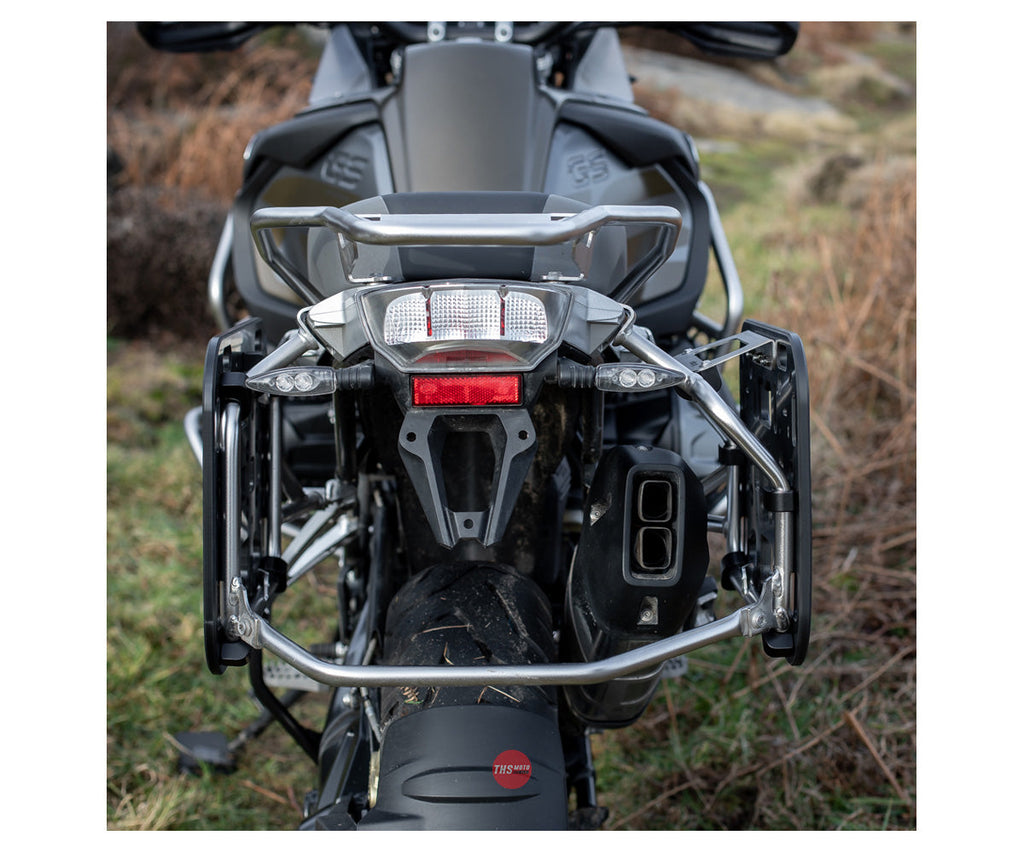 BMW Motorrad GS ADVENTURE pannier frames are designed to mount aluminium cases and do not have a standard flat profile on the exhaust side. This special edition OS-PLATFORM includes a stainless steel adaptor to flatten the profile and provide a strong mounting location for the OS-PLATFORM, which then gives you the option to mount Kriega 'Soft Luggage'.