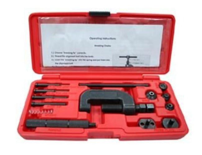 Motorcycle Chain Breaker and Riveting Tool forged ANVIL: 3PCLEVER: 1PC HANDLE: 1PC CHAIN PRESS: 1PCPRESS PLATE:2PCS SPRING: 1PC RIVETER: 1PC PIN 3.8MM:1PC PIN 2.9MM: 1PC PIN 2.2MM: 1PC W/INSTRUCTIONS