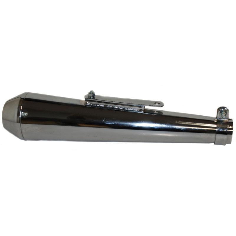 Perfect for those looking for something unique without being over the top. The traditional reverse cone muffler in a shorty version. Capable of fitting 1-3/4" pipes and 1-3/8", 1-1/2" and 1-5/8" pipes with the included reducers, while the included clamp allows for quick and easy installation. The removable baffle can be repacked with muffler packing for quieter running or completely removed to raise those decibels.