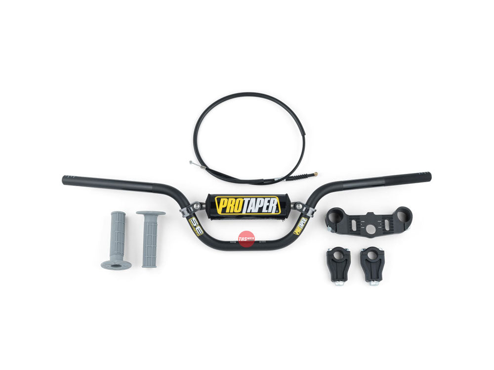 The Pro Taper Pit Bike Kit comes complete with everything needed to transform your mini moto into a backyard thrasher. With Pro Taper SE handlebars providing 143mm of rise, and a fully adjustable top triple clamp, the pro taper kit is ideal for taller riders looking for improved handling, and greater comfort.