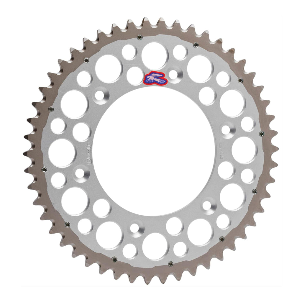 The Renthal Twinring Rear Sprocket is a long-lasting durable Off-Road sprocket that was developed and tested over the course of 5 years. The unique flat face two-piece design keeps weight to a minimum and maximizes durability all while keeping a narrow profile. The outer steel ring is expanded at 200C and then fitted to the aluminium inner before cooling, this process creates a permanent bond while flat socket set screws prevent lateral movement between the rings.