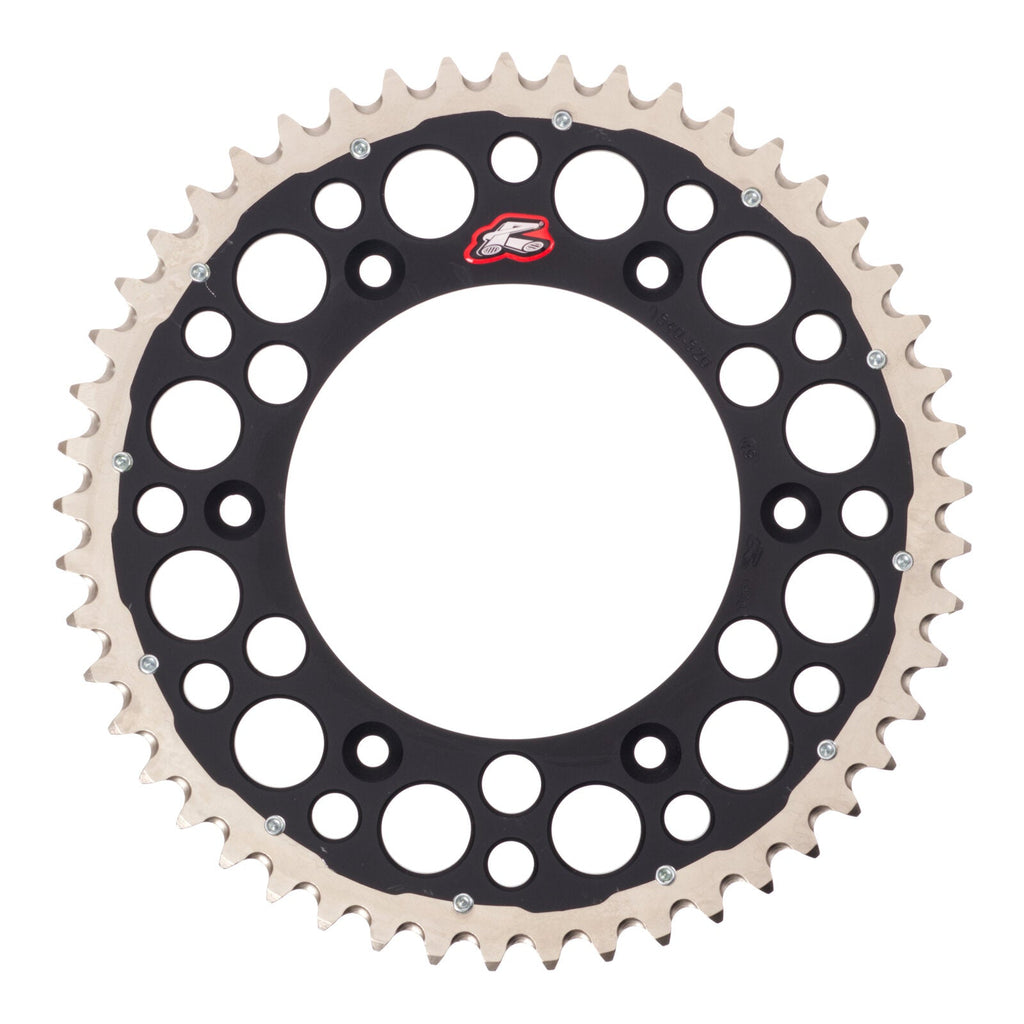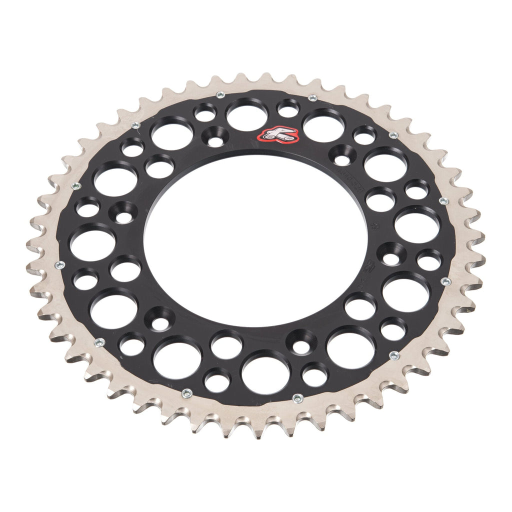 The Renthal Twinring Rear Sprocket is a long-lasting durable Off-Road sprocket that was developed and tested over the course of 5 years. The unique flat face two piece design keeps weight to a minimum and maximizes durability all while keeping a narrow profile. The outer steel ring is expanded at 200C and then fitted to the aluminum inner before cooling, this process creates a permanent bond while flat socket set screws prevent lateral movement between the rings.