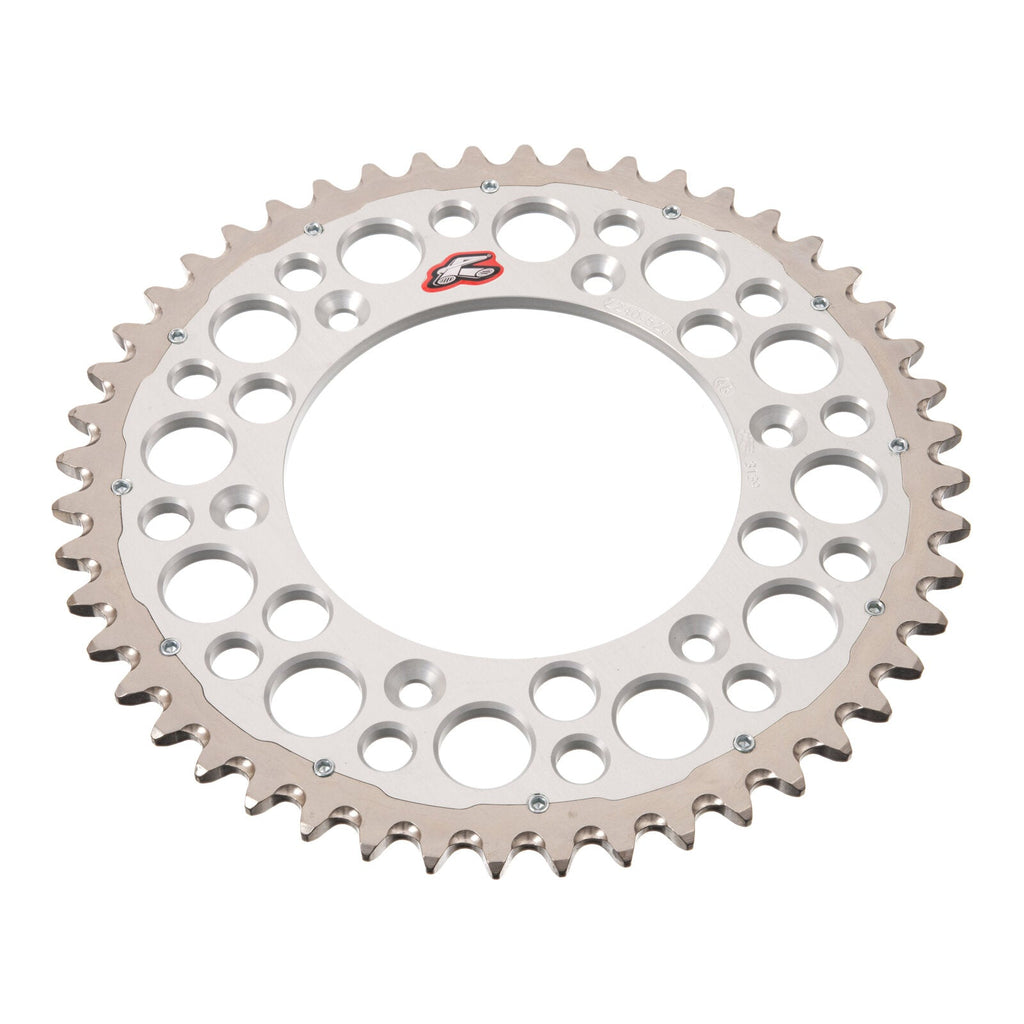 The Renthal Twinring Rear Sprocket is a long-lasting durable Off-Road sprocket that was developed and tested over the course of 5 years. The unique flat face two piece design keeps weight to a minimum and maximizes durability all while keeping a narrow profile. The outer steel ring is expanded at 200C and then fitted to the aluminum inner before cooling, this process creates a permanent bond while flat socket set screws prevent lateral movement between the rings.