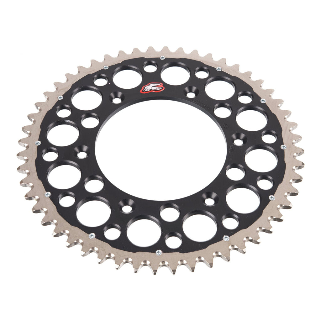 The Renthal Twinring Rear Sprocket is a long-lasting durable Off-Road sprocket that was developed and tested over the course of 5 years. The unique flat face two piece design keeps weight to a minimum and maximizes durability all while keeping a narrow profile. The outer steel ring is expanded at 200C and then fitted to the aluminum inner before cooling, this process creates a permanent bond while flat socket set screws prevent lateral movement between the rings.