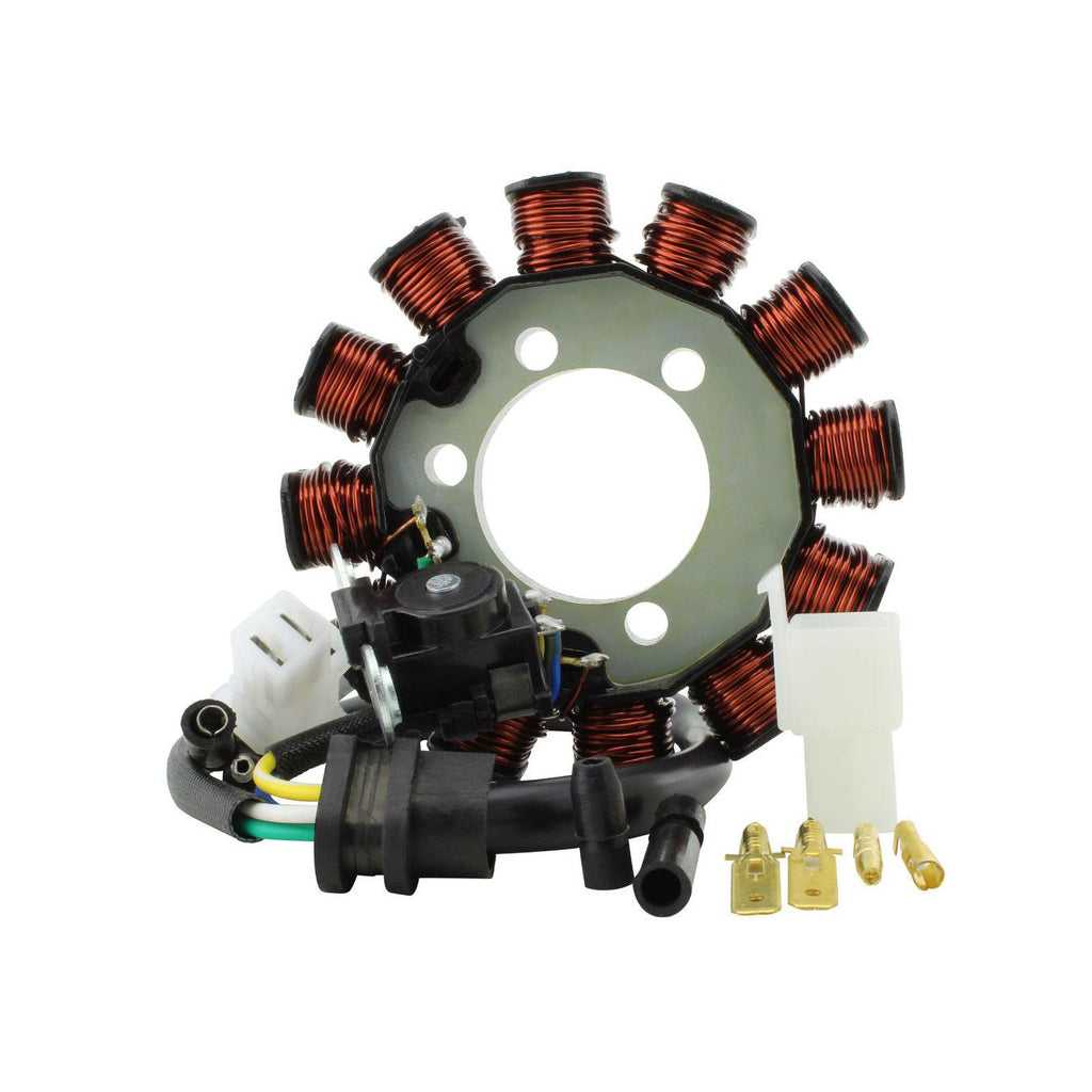 Brand new aftermarket StatorDirect replacement to your original unitPlug-and-play direct fit easy installationHighest grade of lamination materialsHighest grade of copper winding resistant to 200 degrees CelsiusPick up pulsar coil includedConnectors includedRubber grommet includedAll products shipped are testedDimensions:Interior diameter: 35mmExterior diameter: 93mmThickness: 9mmLength of wires stator to grommet: 120mmLength of wires grommet to plug: 230mmLength of pickup coil's wire to grommet: 30mmOther specifications:Number of wires: 3Number of plugs: 3Number of pins: 3Number of poles: 12Wire to wire resistance:Alternator: Green to White = 1.2 ohms +-20%Pickup: Green to Blue/Yellow = 263 ohms +-20%Source: Green = Ground Please Note:All electrical components must be fitted by a qualified technician.Before fitting electrical components ensure the root cause of the original failure has been addressed.The absence of either of points 1 or 2 above will void any warranty.