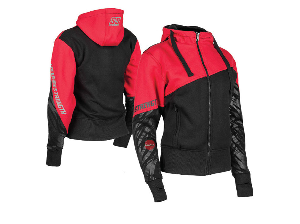 The Cat Outta Hell™ Women's Armored Hoodie is a protective motorcycle jacket hiding in sheep's clothing. It features CE approved shoulder, elbow and back protector inside a comfortable cotton-poly chassis. The reflective Speed and Strength logos and fierce tiger stripes are prominently displayed on both arms and makes you just want say rawr!