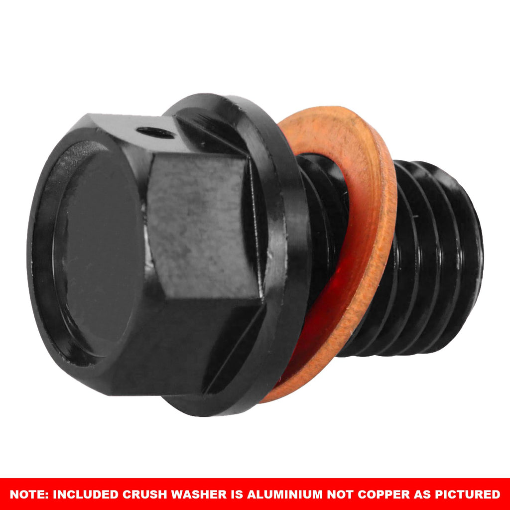 Maximise your motorcycles engine cleaning system with Whites Magnetic Oil Drain Plugs available for almost every make & model of motorcycle these anodised aluminium plugs include a magnetic core that is designed to catch any metal shavings in your motorcycles oil. Extra protection can't hurt a simple inexpensive magnetic sump plug could prevent a costly engine rebuild or prevent permanent damage to your engine.Thread Size: M12 x 10mmThread Pitch: 1.25mmColour: BlackPre-drilled hole in the head for use with safety wireAluminium crush washer prevent leaksAnodised aluminium for a great look and durabilityNOTE: All Aluminium Magnetic Drain Plugs should be tightened to the OEM specifications found in your owners/service manual.